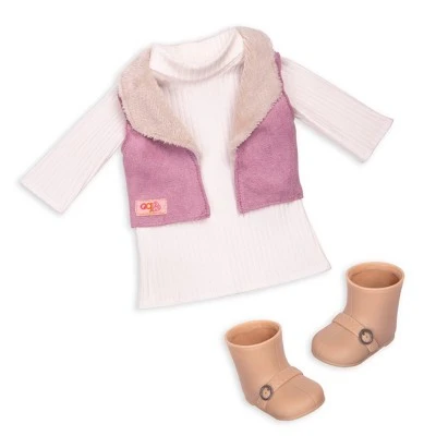Meet Kinzie and her adorable puppy! This Our Generation 18-inch doll has dark-blue eyes that open and close, and her long black hair is fun to brush and style! Kinzie loves to walk her loyal pal around the neighborhood — especially to the dog park. Use the pink leash to keep her pup always by her side, and give your furry friend extra style by easily clipping the barrel accessory to the collar! Kinzie has a soft, cuddly body and can rotate her arms and legs to play fetch with the pink ball. She can also easily change outfits to dress up for any activity! She is wearing a comfy sweater dress, a pink vest with a cute faux-fur collar, and easy-to-slip-on booties. Her outfit even matches the mini bow on her pup’s ear! The best styles are those we can share with our pets!