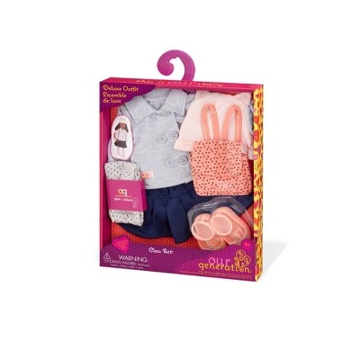 Send your doll back to school in the Our Generation Class Act Deluxe outfit for 18-inch dolls! The pink cat-ear hat and double-breasted jacket made of soft gray jersey will keep your doll warm in the fall, and the classic look of the pleated blue skirt and polka-dot print gray tights put an adorable touch on the school-girl ensemble. This outfit is easy to mix and match with other Our Generation clothes, and will give your dolls endless fashion styles. (Dolls sold separately. Compatible with American Girl dolls)